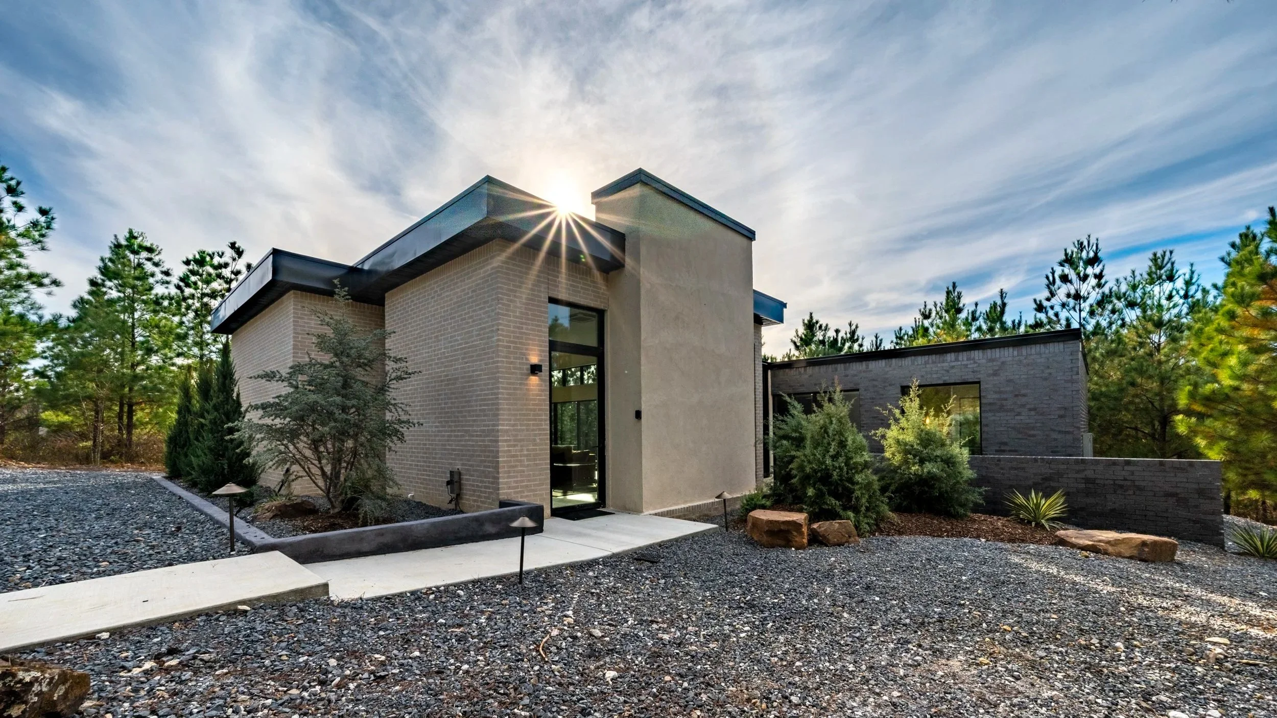 This modern single-family home in Broken Bow, Oklahoma, features an open living and kitchen layout that opens to a cozy outdoor patio surrounded by trees. Glass-lined connectors lead to the main bedroom and a small reading and TV room, filling the spaces with natural light and views of the forest. The reading nook’s playful wallpaper adds character and warmth, creating a comfortable retreat within the home.